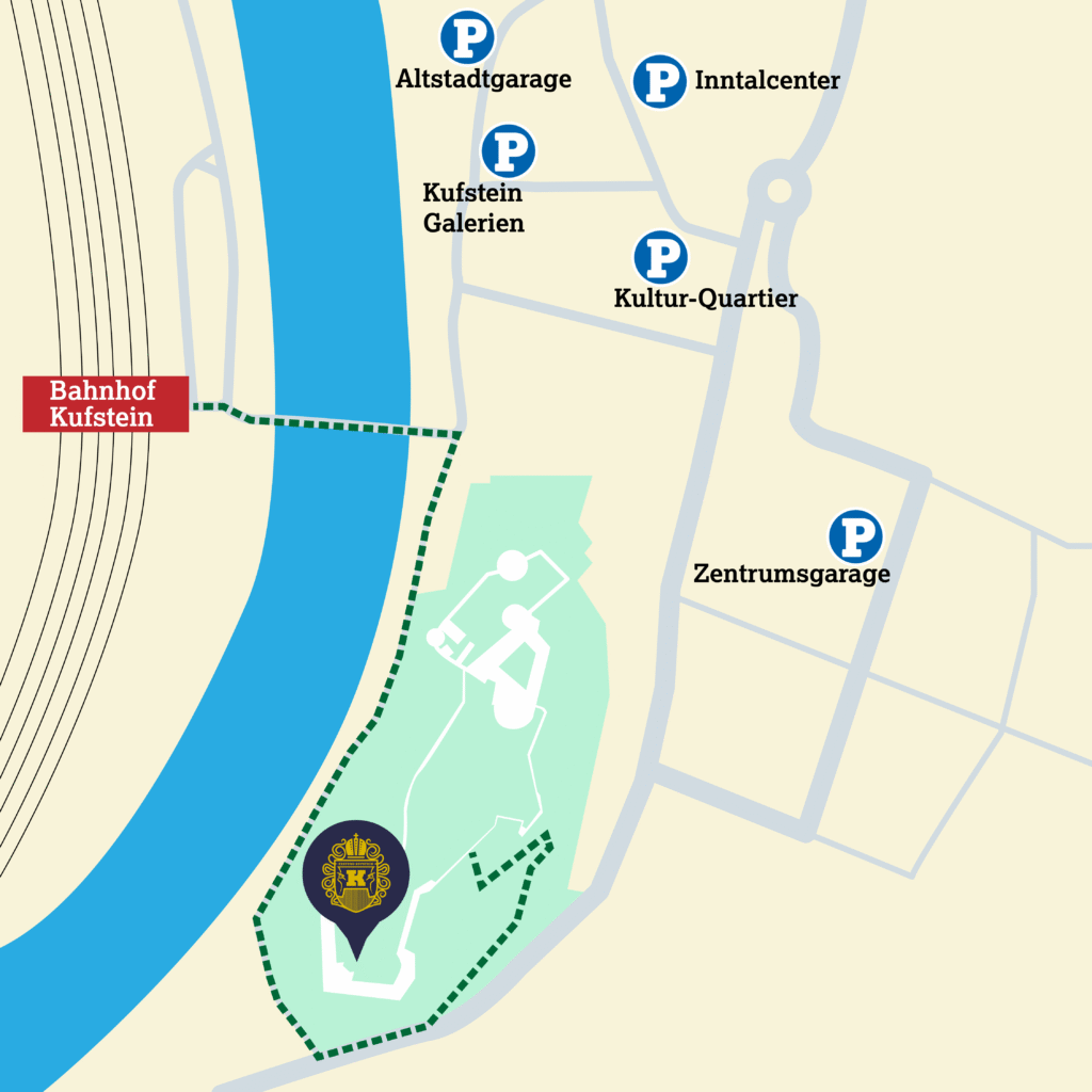 Der Aufgang zum Veranstaltungsgelände ist nur über den Fußweg zur Festungsarena | Aufgang Kaiserjägerweg (Kinkstraße 36) möglich. Die Gehzeit beträgt ca. 5-8 Minuten. Oben bei der Festungsarena angelangt, befindet sich der Hauptzugang zum Veranstaltungsgelände mit Abendkassa. Zu beachten: dort können keine Tickets für die Besichtigung der Festung gekauft werden und es ist auch kein Zugang zu den musealen Bereichen der Festung über diesen Eingang möglich. Ein Zugang zur Festungsarena über den Haupteingang der Festung Kufstein ist nicht möglich. Die Panoramabahn ist nicht in Betrieb!